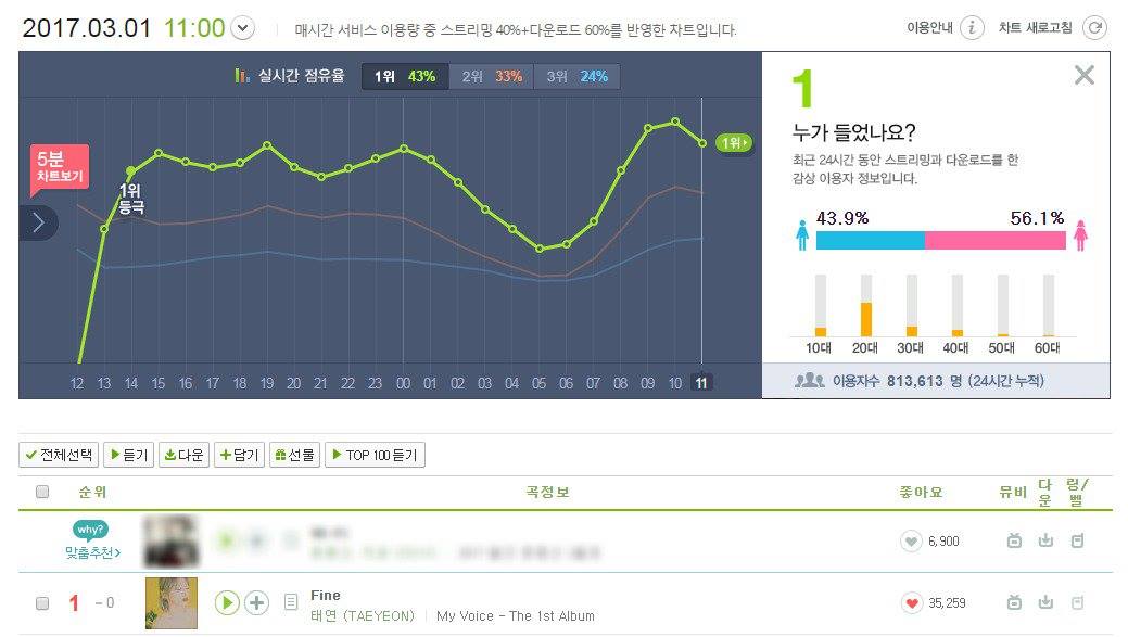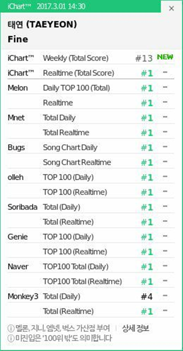 Việc “chạm nóc” liên tục các BXH âm nhạc tại Hàn Quốc của ca khúc Fine cũng đã được ghi lại.