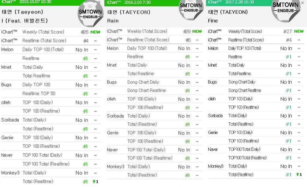 Taeyeon là nữ nghệ sĩ solo duy nhất tại Hàn Quốc từng có sản phẩm âm nhạc “all kill” các BXH âm nhạc vào 3 năm liên tiếp từ 2015 - 2017 lần lượt với I, Rain và Fine.