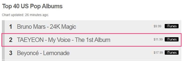 Chiều 3/1, sau 1 ngày lăm le BXH album pop của Itunes toàn cầu thì My Voice đã “nhảy” được lên vị trí ấn tượng thứ 2, sau 24K Magic của Bruno Mars.