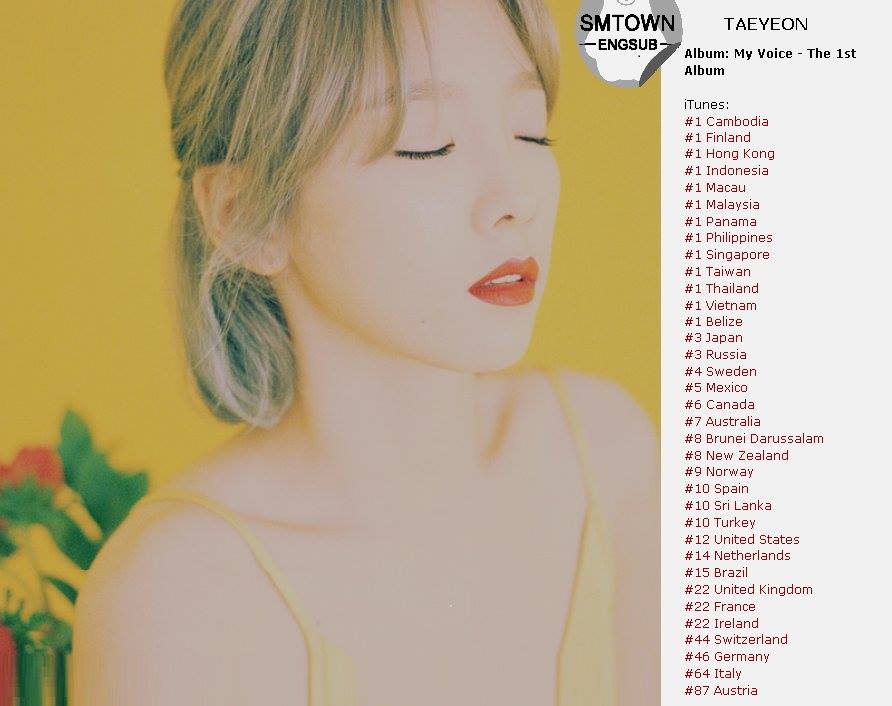 Số lượng tiêu thụ trực tuyến của Taeyeon khá ấn tượng khi nó mang về thành tích đứng đầu 13 nước châu Á cho My Voice, trong đó có Việt Nam.