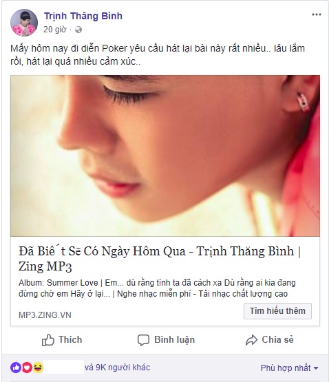 Trên trang cá nhân, Trịnh Thăng Bình chia sẻ khi anh đi diễn ở bất cứ đâu cũng đều được khán giả yêu cầu hát lại Đã biết sẽ có ngày hôm qua.
