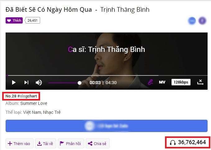 Đã biết sẽ có ngày hôm qua lọt top 28 ca khúc được nghe nhiều nhất và đạt hơn 36 triệu lượt nghe trên một trang nhạc trực tuyến.