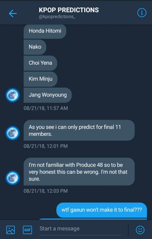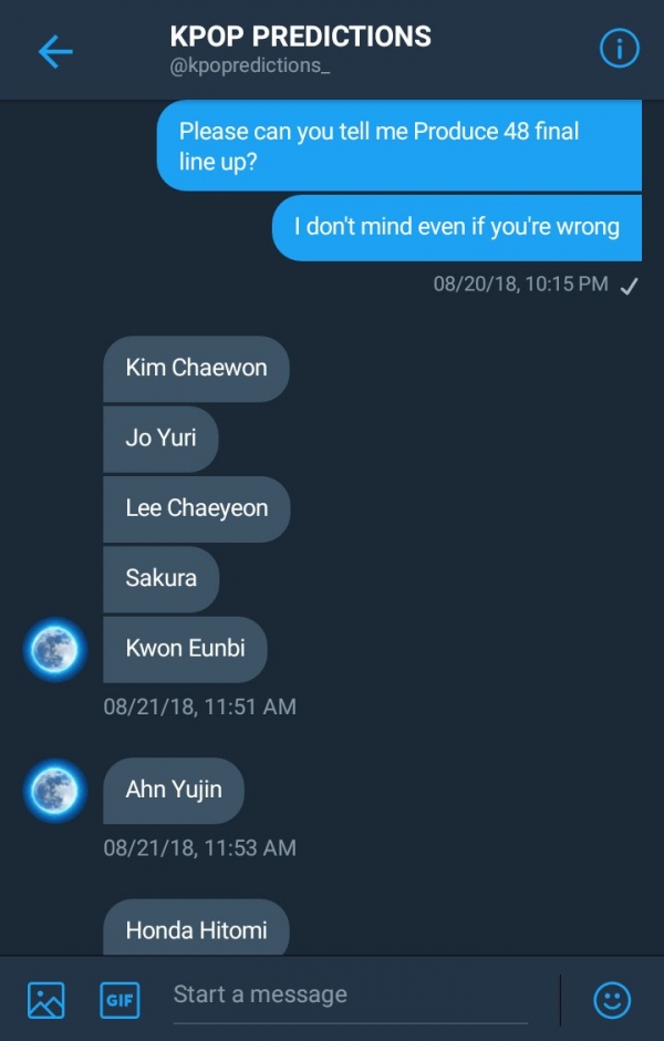 Tiên đoán “thần thánh” và sởn da gà nhất của @kpopredictions_ không thể không kể đến lần tài khoản này đoán trúng phóc 11 thành viên được debut của chương trình Produce 48. Không những thế, trong danh sách 11 này thành viên không hề có cái tên Kaeun - một trong những thí sinh được người hâm mộ cho rằng gần như chắc chắn sẽ có suất debut, cuối cùng, cô nàng chỉ lọt top 14 chung cuộc, đúng như lời tiên đoán của @kpopredictions_.