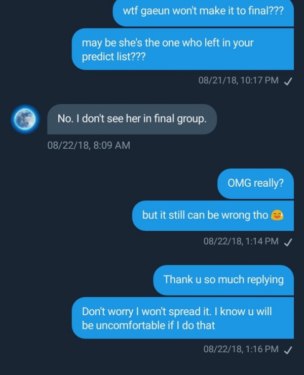 Đoạn chat được gửi từ 20/08, và mãi đến 31/08 thì tập cuối của chương trình Produce 48 mới được lên sóng.