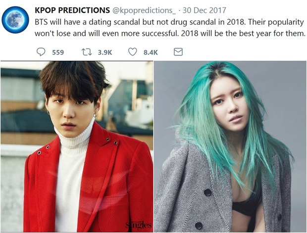 Cuối 2017, nhân vật này cho rằng BTS sẽ vướng phải scandal hẹn hò trong năm 2018. Và quả nhiên, thành viên Suga đã từng bị kết đôi với cô nàng Suran khi cả hai cùng hợp tác trong ca khúc WINE.