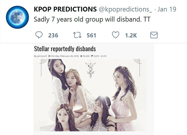 @kpopredictions_ từng đăng dòng trạng thái một nhóm nhạc 7 năm sẽ tan rã. Một tháng sau, Stellar chính thức chấm dứt hợp đồng trong sự tiếc nuối của người hâm mộ vì nhóm còn chưa kịp nổi tiếng.