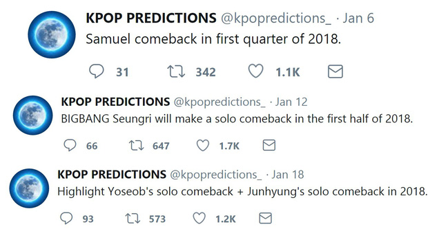 Ngay cả thời gian comeback của loạt nghệ sĩ như Samuel, Seungri (BIGBANG), Yoseob và Junhyung (Highlight) đều được tài khoản này tiên đoán chính xác.