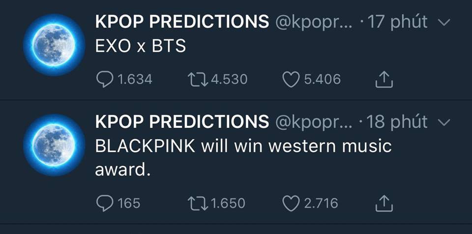 Là fan “cứng cựa” của K-Pop thì chắc hẳn không ai không biết đến một tài khoản nổi tiếng có tên KPOP PREDICTIONS (@kpopredictions_) với bức ảnh đại diện là hình mặt trăng xanh đầy bí ẩn. Không phải bỗng nhiên mà tài khoản Twitter của nhân vật này đã đạt gần 320 nghìn người theo dõi. Mà điều đặc biệt ở chỗ, hàng loạt dự đoán về những sự kiện của K-Pop trong tương lai được tài khoản này đăng tải lên mạng xã hội, sau này đều trở thành sự thật. Tỉ lệ các bài post chính xác tới 90%, đến nỗi nhân vật này còn được mệnh danh là “nhà tiên tri Vanga của K-Pop”. Nhắc đến nhà tiên tri Vanga, lịch sử thế giới từng ghi nhận rất nhiều sự kiện được bà tiên đoán chính xác, vậy nên bạn phải hiểu nhân vật bí ẩn kia “thần thánh” đến mức nào mới được mệnh danh như vậy.