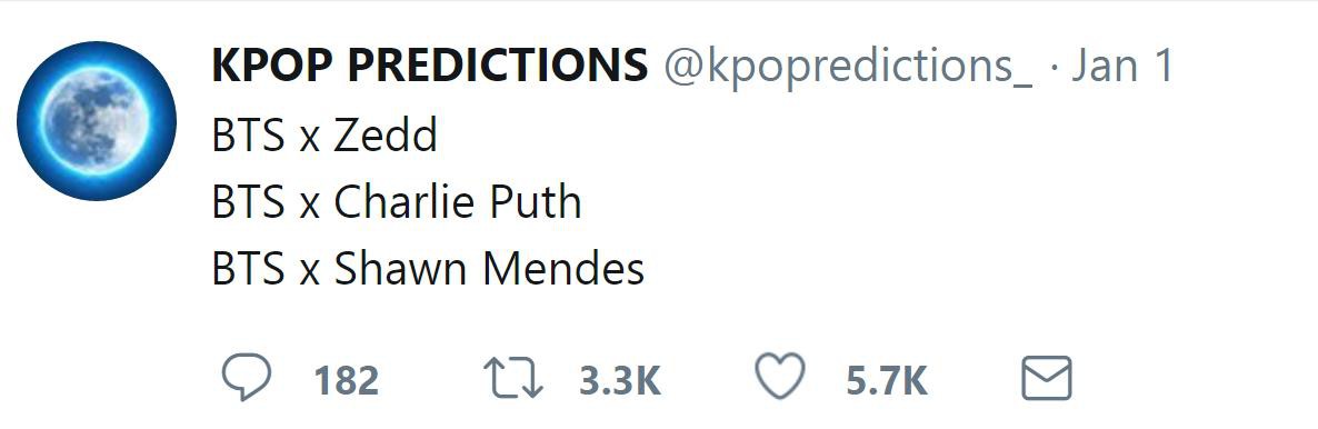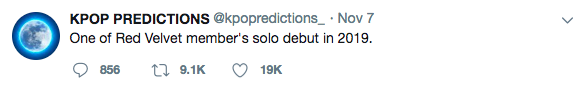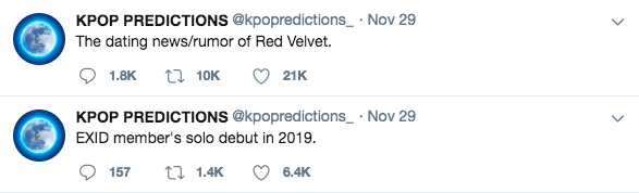 Tiên đoán được nhiều sự kiện là thế, tài khoản này vẫn còn kha khá những lời tiên tri mà đến hiện tại vẫn chưa có câu trả lời về tính trung thực của nó. Sau đây là một loạt dự đoán của @kpopredictions_ liên quan đến những tên tuổi đình đám K-Pop vẫn đang còn là một ẩn số với người hâm mộ: