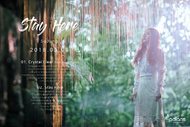 Ladies Code's Sojung cũng chọn tháng 3 để comeback với tư cách nghệ sĩ solo. MV chủ đề Stay Here chính thức lên sóng vào 8/3. Riêng ca khúc Crystal Clear - món quà mà cô nàng dành tặng fan sẽ ra mắt trước đó 3 ngày.