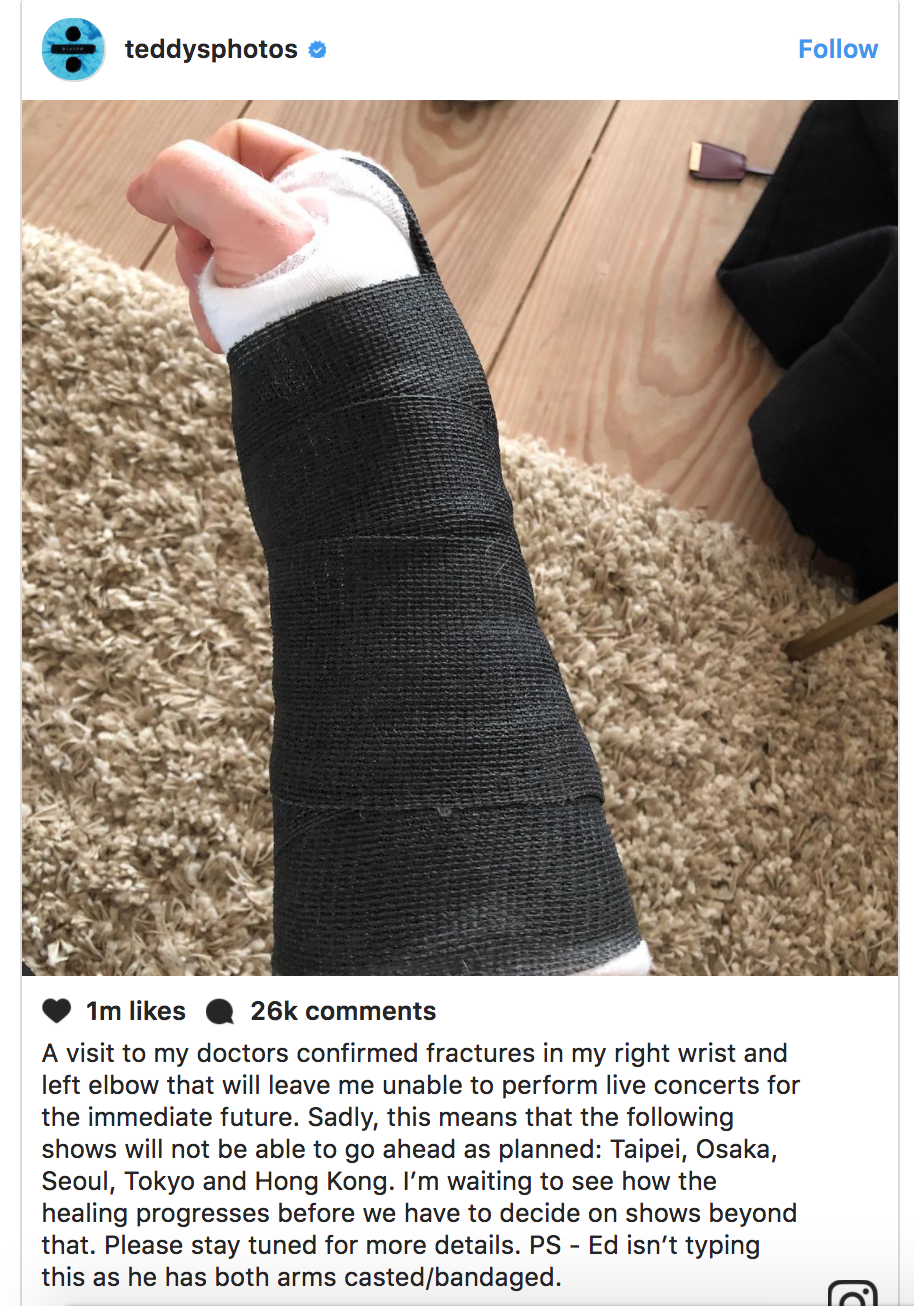 Mới đây, người hâm mộ châu Á đón nhận thông tin không mấy vui vẻ khi nam ca sĩ Ed Sheeran ra thông báo chính thức về việc huỷ toàn bộ tour diễn của anh nơi đây. Nguyên nhân là vì giọng ca này gặp tai nạn giao thông, khi đang di chuyển bằng xe đạp thì bị một chiếc ô tô đụng phải khiến anh bị thương, phải băng bó cả cánh tay.