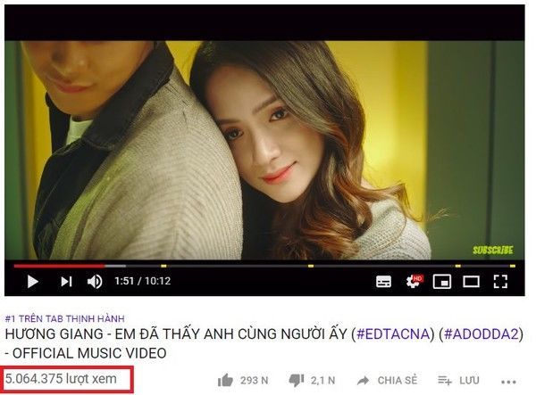 Sau 24h, MV #EDTACNA đã đạt hơn 5 triệu lượt xem và lọt top 1 trending Youtube. (Con số thống kê được Youtube hiển thị ở thời điểm 19h30 ngày 12/3).