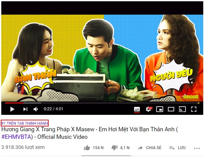 Vừa qua, Hương Giang đã khiến các fan vô cùng phấn khích khi chính thức lên sóng MV mới nhất của mình mang tên Em hơi mệt với bạn thân anh. Ngay khi lên sóng, sản phẩm đã nhanh chóng nhận được rất nhiều sự quan tâm và chú ý của người hâm mộ. Và mới đây, sau 2 ngày ra mắt, MV của Hương Giang đã chính thức vươn lên vị trí top 1 trending và cho đến thời điểm hiện tại đã đạt gần 4 triệu lượt xem.