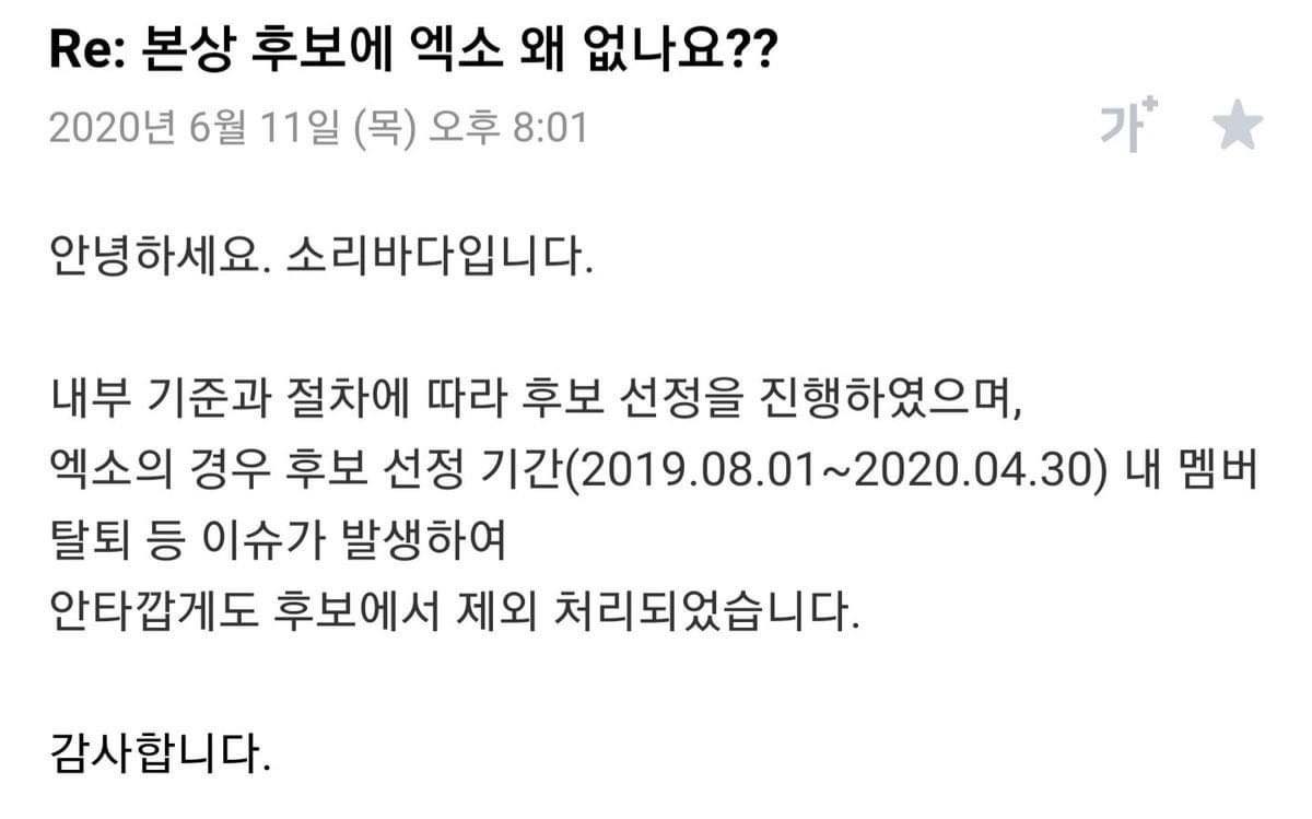 Mới đây, cộng đồng người hâm mộ của EXO vô cùng bức xúc khi BTC lễ trao giải Soribada Best-K Music Awards 2020 gạch tên EXO khỏi hạng mục đề cử giải Bonsang, ngay sau khi phát hiện các EXO – L đã nhanh chóng gửi mail cho BTC để yêu cầu lời giải thích rõ ràng lý do vì sao EXO lại “mất hút” một cách vô cớ trên hạng mục đề cử. Tuy nhiên, phản hồi của BTC Soribada lại làm cho làn sóng phẫn nộ của các fan EXO dâng cao hơn bao giờ hết, đó là vì EXO…có thành viên rời nhóm trong thời gian đề cử là từ năm 2019 – 2020 bị gạch tên.