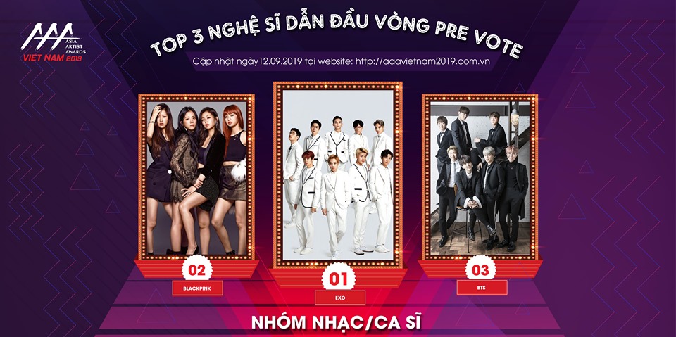 Dù công bố đóng cổng bình chọn dành cho nghệ sĩ Việt Nam nhưng hạng mục Ca sĩ/Nhóm nhạc Hàn Quốc được yêu thích nhất của lễ trao giải Asia Artist Awards 2019 (AAA 2019) cũng được các fan Kpop vô cùng quan tâm và cùng nhau bình chọn. Mới đây trên trang fanpage của giải thưởng này đã đăng tải hình ảnh Top 3 dẫn đầu bình chọn vòng Pre-Vote AAA 2019 dành cho ca sĩ và nhóm nhạc Hàn Quốc.