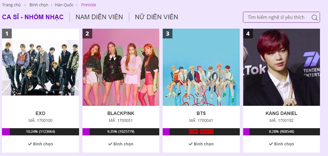 Lượt bình chọn cho các nghệ sĩ tại hạng mục Ca sĩ/Nhóm nhạc Hàn Quốc được yêu thích nhất tại thời điểm tối 12/9.