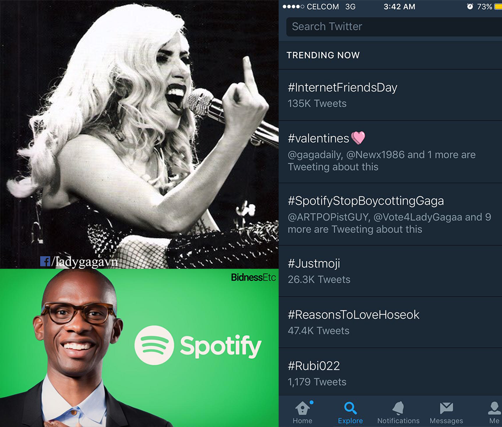 Hashtag #SpotifyStopBoyCottingGaga đang là trending trên Twitter tại thời điểm này và hình ảnh của quản lí cũ Troy Carter (góc trái). (Nguồn ảnh: Hội những Little Monster Việt Nam tôn sùng Lady Gaga)