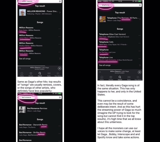 Cụ thể, nếu bạn tìm kiếm những từ khoá như “Lady Gaga“, “Gaga” hay tên các bài hát Bad Romance, Telephone thì sẽ đều nhận được kết quả “như không”. Thậm chí, đỉnh điểm là single Million Reasons hiện đang vươn lên vị trí No.4 BXH Billboard Hot 100 lại mất hút trong playlist Today's Top Hit trong khi tất cả các bài hát top 10 khác đều có chỗ đứng.