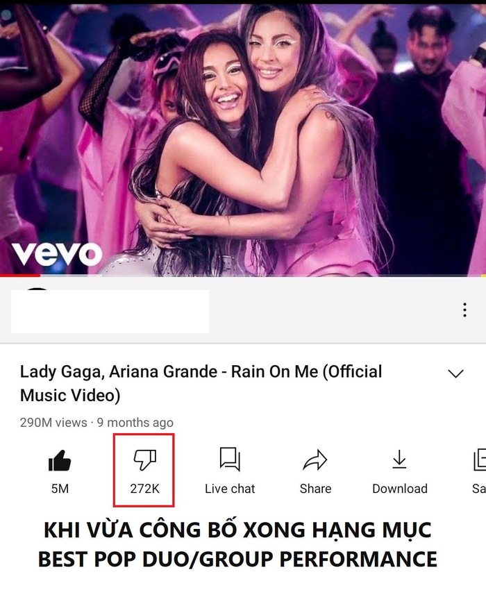 Gần đây, cư dân mạng đã không khỏi rầm rộ vụ việc người hâm mộ của nhóm BTS đã nhấn nút dislike MV Rain On Me của bộ đôi Ariana Grande và Lady Gaga sau khi vuột mấy giải thưởng Best Pop Duo/Group Performance tại Grammy 2021. MV này được cho rằng đã tăng gần 100.000 lượng dislike và mọi tội lỗi đều đổ dồn về cho ARMY (tên gọi fandom của BTS). Và giữa tâm điểm của vụ việc, fan BTS đã đưa ra bằng chứng làm rõ việc “bão” dislike MV Rain On Me.