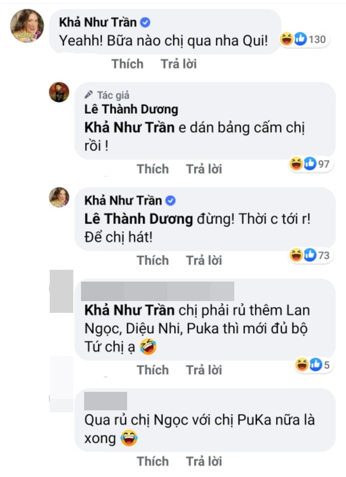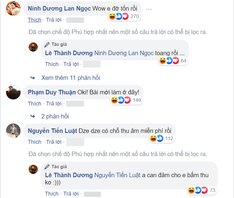 Dưới phần bình luận, không khó để nhìn ra loạt gương mặt thân quen như: Ninh Dương Lan Ngọc, Khả Như, Jun Phạm, Tiến Luật,… Loạt sao này đều thể hiện sự vui mừng của mình vì trong thời gian tới nếu có dự định hát hò thu âm thì cũng được khoản chi phí “sương sương”.