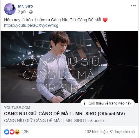 Mr. Siro chia sẻ dòng trạng thái mừng kỷ niệm tròn 1 năm ra mắt MV Càng níu giữ càng dễ mất.