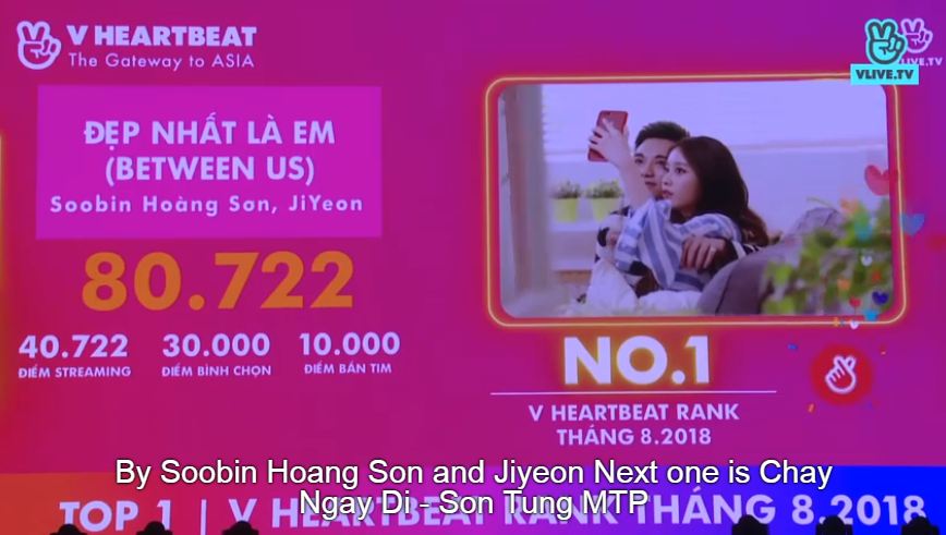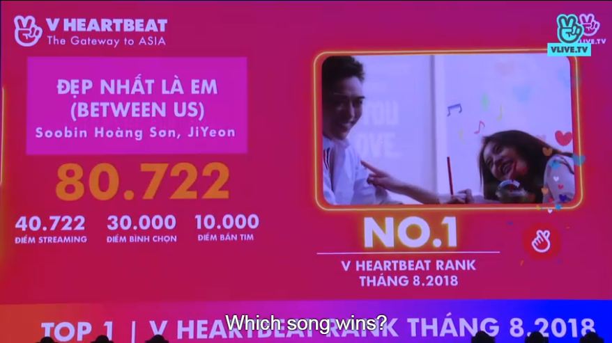 Tại đây, bảng xếp hạng V Heartbeat Rank tháng 8 đã được công bố, Chạy ngay đi bất ngờ vuột mất “ngôi vương” về tay Đẹp nhất là em của cặp đôi Soobin Hoàng Sơn và Jiyeon. Khỏi phải nói người hâm mộ của cả hai sung sướng đến thế nào, thêm một lần nữa sân khấu V Heartbeat lại ngập tràn tiếng hô vang tên của cặp song ca Việt - Hàn.