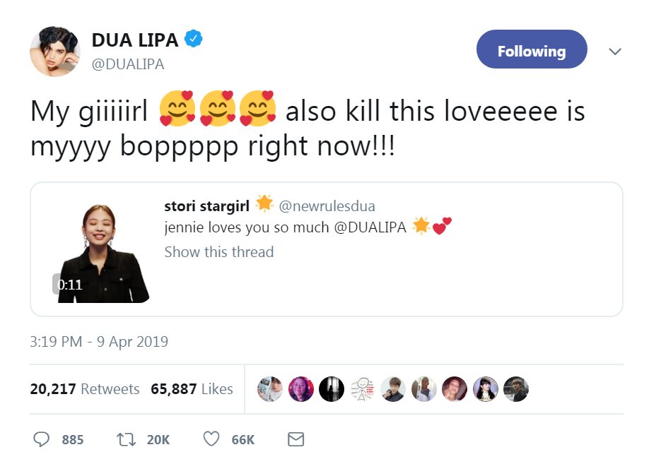 Những tưởng Dua Lipa sẽ khó có thể thấy đoạn clip trên, nhưng ngay lập tức Dua Lipa đã vô cùng hào hứng retweet lại đoạn clip ngắn trên. Đồng thời bày tỏ ngược lại tình cảm cho Jennie và “hit” mới nhất của BlackPink Kill This Love.