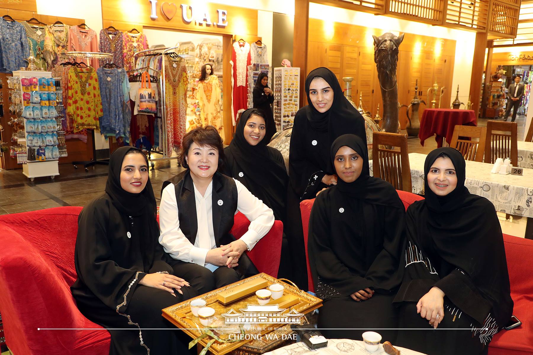 Mới đây, đệ nhất phu nhân Kim Jung Sook có chuyến thăm chính thức 3 ngày với tổng thống Hàn Quốc Moon Jae In tới các tiểu vương quốc Ả rập thống nhất. Trong cuộc gặp gỡ đông đảo sinh viên tại một trung tâm văn hóa Hàn Quốc ở Abu Dhabi ngày 25/3, phu nhân cùng cả nhóm đã ghé qua chợ Souk (một khu chợ Ả rập truyền thống), thưởng thức trà và trò chuyện bằng tiếng Hàn Quốc.