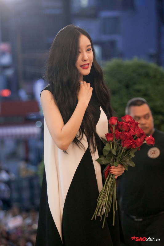 Valak đội nón lá cầm hoa đến gặp thần tượng.