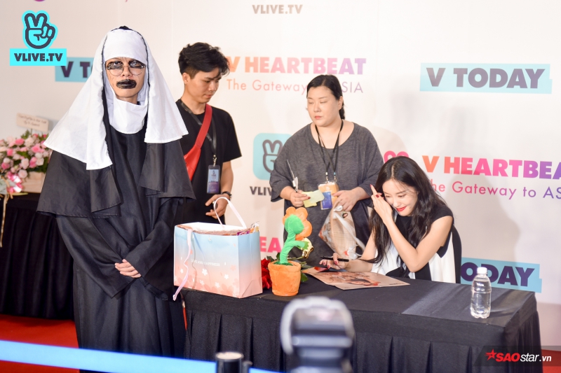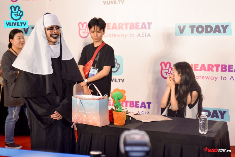 Trong không khí nhộn nhịp của buổi fansign, người hâm mộ được phen “hoảng vía” khi đón tiếp một nhân vật nổi bật - “ác quỷ ma sơ” Valak. Ngay đến cả Hyomin cũng không “đỡ” nổi độ “lầy” của anh chàng này và “cười ngất” khi ký tặng.