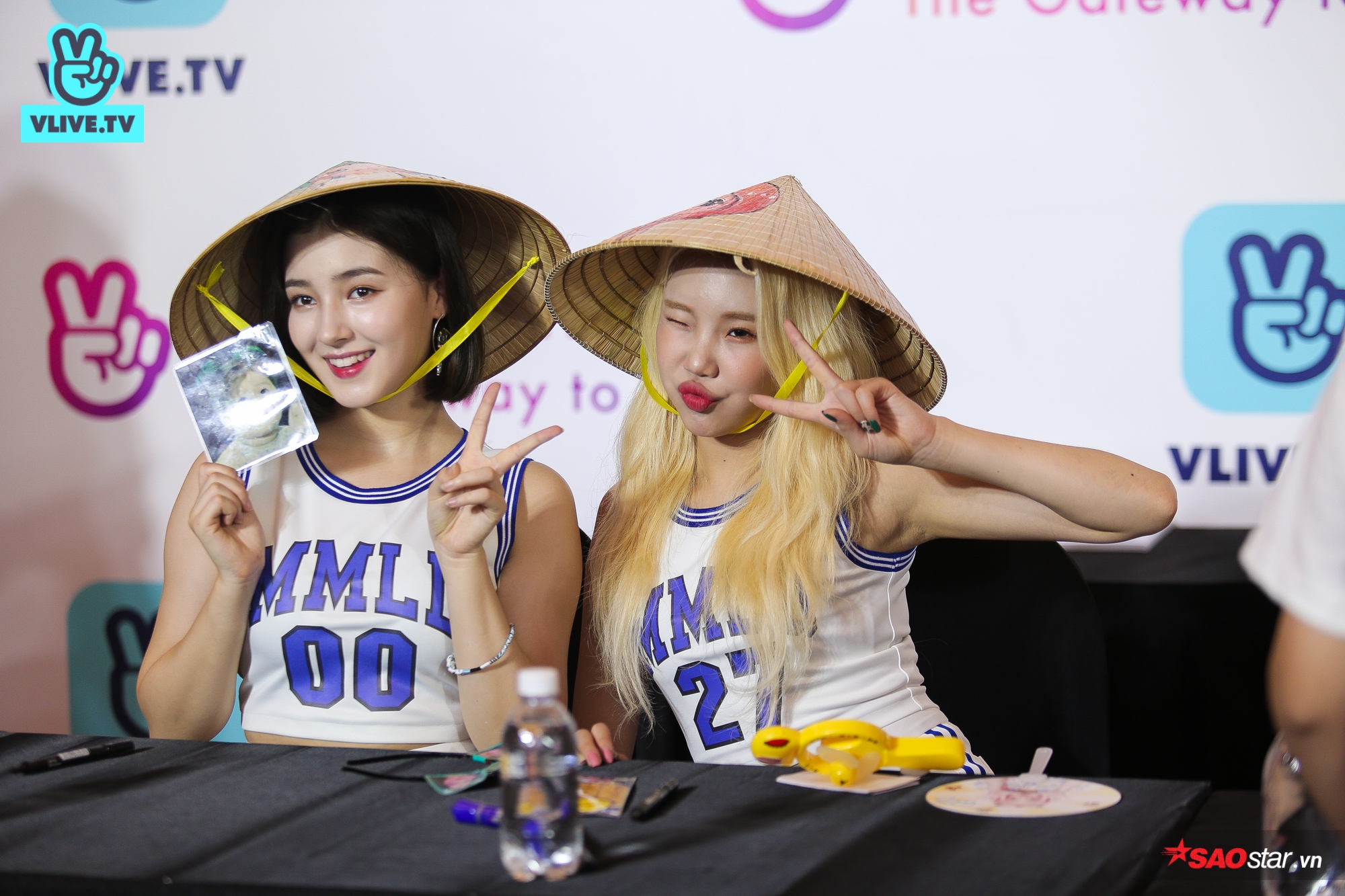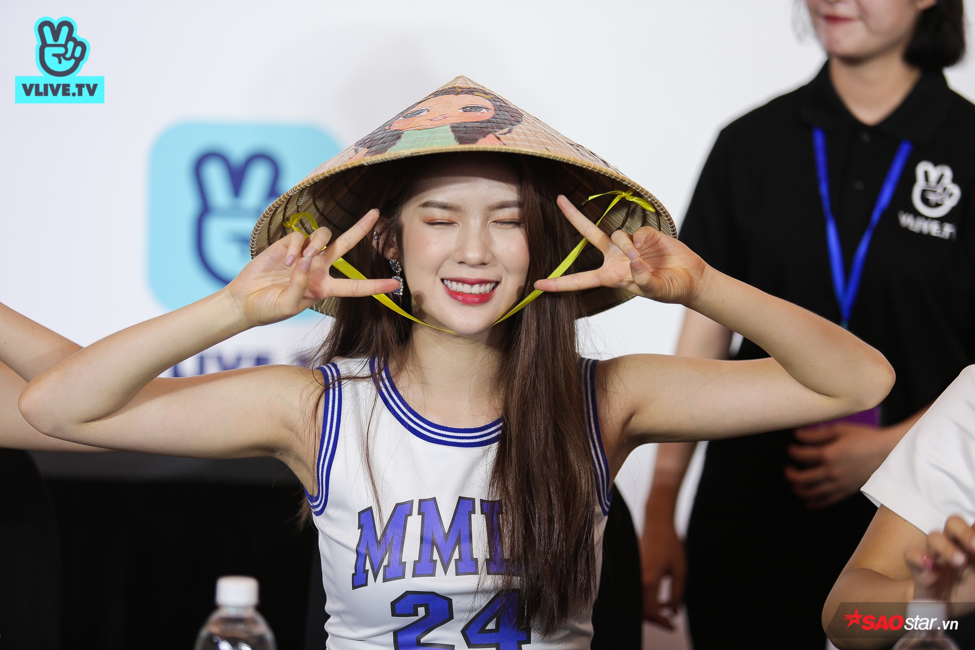 Các cô gái tạo dáng dễ thương với nón lá mà fan Việt tặng.