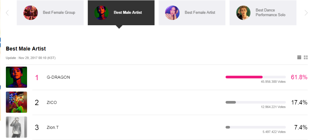 Đúng như dự đoán của người hâm mộ, mặc dù chiếm lượng vote cao nhất, trưởng nhóm BigBang G-Dragon vẫn không giành chiến thắng ở hạng mục Nam nghệ sĩ xuất sắc nhất. Người được xướng tên là nam ca sĩ cá tính Zico với 17,4 % số phiếu bình chọn từ khán giả. Tuy nhiên, vì chẳng xuất hiện tại đêm trao giải trực tiếp nên cũng không có chuyện GD phải ra về trắng tay.
