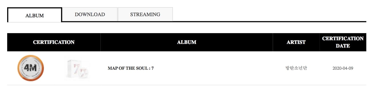 Nhóm BTS là một trong những cái tên nằm trong danh sách Gaon đã cập nhật nghệ sĩ đạt chứng nhận Bạch kim tuần đầu tiên tháng 4. Một lần nữa nhóm BTS khiến khán giả không khỏi nể phục với khả năng tiêu thụ album. Sản phẩm Map Of The Soul: 7 đánh dấu màn comeback đầu tiên trong năm 2020 của BTS hiện đã cán mốc 4 triệu bản trên Gaon. Điều này khiến BTS trở thành nghệ sĩ đầu tiên và duy nhất cho đến nay nhận được chứng nhận Quadruple Million trên Gaon.