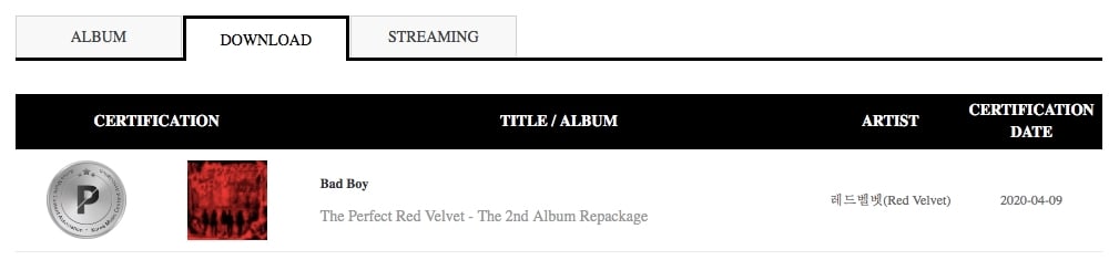 Ở hạng mục lượt tải xuống, Red Velvet là cái tên duy nhất góp mặt. Tuy nhiên điều khiến người hâm mộ bất ngờ là không phải ca khúc mới Psycho gặt hái được mà là đến từ bản hit cũ Bad Boy. Ca khúc này của Red Velvet đã cán mốc hơn 2,5 triệu lượt tải xuống từ hệ thống Gaon. Chính vì thế Red Velvet đã đạt chứng nhận Bạch kim ở hạng mục download này.