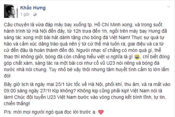 “Từ 12h trưa đến 1h, ngồi trên máy bay Hưng đã sáng tác xong một bài hát dành tặng cho bóng đá Việt Nam! Thực sự quá tự hào và cảm xúc dâng trào quá nên ý tứ cứ thế mà tuôn ra, giai điệu và ca từ cứ đến đâu là hoàn thành đến đó. Người nhạc sĩ chẳng có món quà gì, thể thao thì không giỏi, bóng đá còn chẳng hiểu việt vị nghĩa là gì, chỉ biết đóng góp chất xám, sáng tác ra một bài coi như cổ vũ U23 nói riêng và bóng đá nước nhà nói chung. Tuy nhỏ bé vậy thôi nhưng tâm huyết tình cảm to lớn lắm đó!” - Nam nhạc sĩ “mát tay” cho biết.