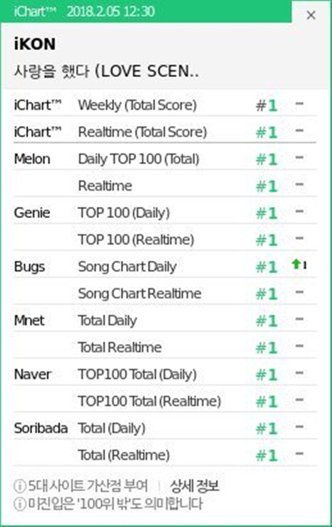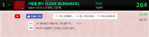 Các fan của iKON đang cực phấn khích trước thông tin nhóm đã đạt “all-kill” với bài hát mới. Cụ thể, Love Scenario - ca khúc chủ đề từ album Return phát hành ngày 25/1 đang nhận sự quan tâm đặc biệt và đạt thông số digital ấn tượng tại Hàn Quốc. Hiện bài hát đã dẫn đầu các trang Bugs, Naver Daily Charts,… mặc sự trở lại cùng thời điểm Bad Boy (Red Velvet).