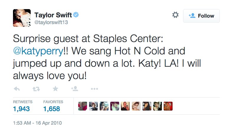 Rõ ràng, dù là ai xuất hiện trong concert của ai thì thế giới cũng đều sẽ chấn động cả. Đã tròn 8 năm rồi, kể từ lần cuối cùng Katy Perry và Taylor Swift cùng thân thiết xuất hiện cùng nhau trên sân khấu California Dreams Tour và cùng nhau hát Hot n Cold. Người hâm mộ của cả hai khi xem lại màn trình diễn ấy, không ai không khỏi nghẹn ngào…