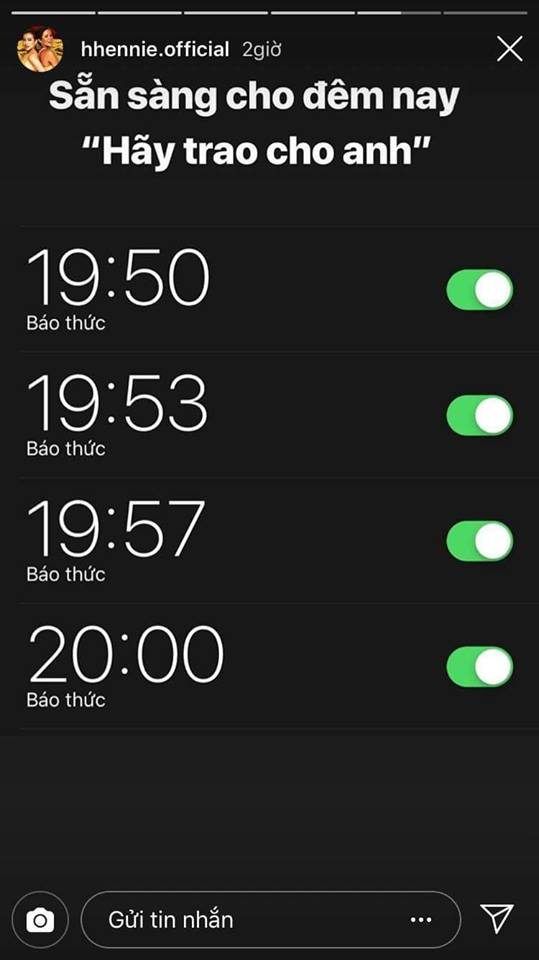 Trước đó, nàng Hậu H'Hen Niê còn cho thấy mình chả kém bất kỳ Sky nào khi… đặt sẵn chuông báo thức đúng boong 20 giờ tối 1/7 để đón xem “siêu phẩm” Hãy trao cho anh. Cụ thể, trên trang Instagram cá nhân, H'Hen Niê đã đăng tải hình ảnh đặt sẵn chuông báo thức cho mình để chờ đến giờ MV lên sóng. Không những thế, số giờ mà H'Hen Niê đặt chuông cho… “khỏi quên” cũng làm người hâm mộ “phát cuồng” vì sự dễ thương của cô.