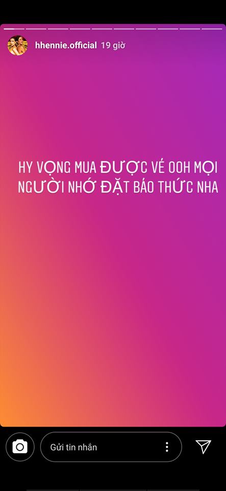 Cũng chỉ còn ít ngày nữa, liveshow đầu tiên của Sky Tour 2019 sẽ chính thức diễn ra tại TP. HCM. Trong khi các Sky còn đang “loay hoay” để mua vé thì cô nàng “Sky bự” H'Hen Niê đã hào hứng chia sẻ hình ảnh “cầm chắc trong tay” 5 chiếc vé dự đêm nhạc của thần tượng. Trên story, H'Hen Niê không quên chia sẻ “hoàn cảnh” phải canh đúng thời gian để “săn” cho mình những tấm vé quý giá.