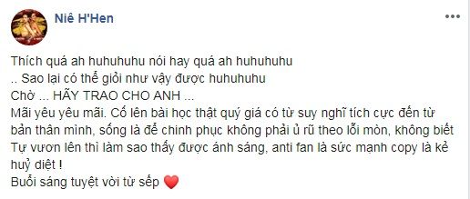 Không chỉ muốn “trao hết” cho Sơn Tùng, trên trang cá nhân, H'Hen Niê còn đăng tải một dòng trạng thái bày tỏ sự ngưỡng mộ với giọng ca Chạy ngay đi. Qua đó, cô thể hiện sự phấn khích, hào hứng với sản phẩm Hãy trao cho anh và còn chia sẻ Sơn Tùng chính là người truyền cảm hứng để cô suy nghĩ đến những điều tích cực và không đi theo lối mòn.