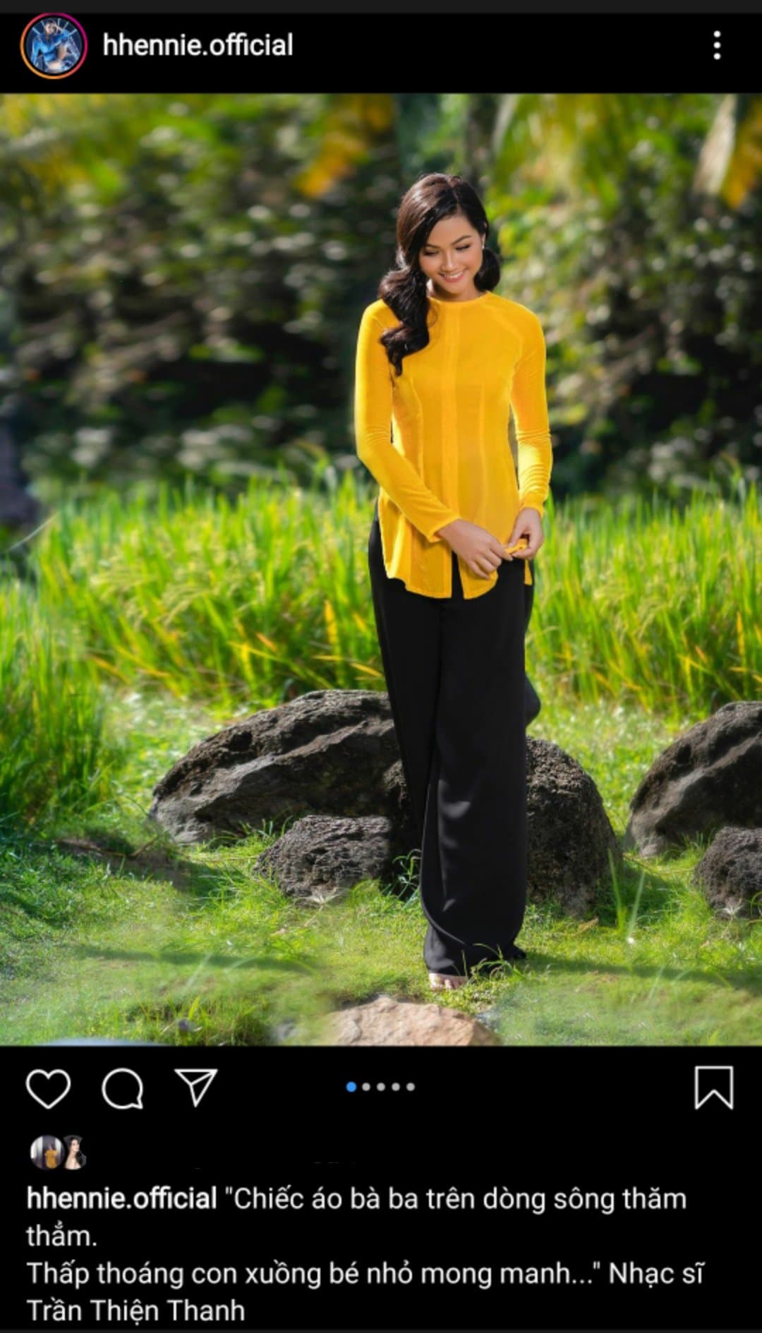 Cụ thể, đi kèm những hình ảnh xinh đẹp trong chiếc áo Bà ba thướt tha, nổi bật là dòng caption vô cùng “ăn rơ”: “Chiếc áo Bà ba trên dòng sông thăm thẳm, thấp thoáng con xuồng bé nhỏ mong manh…”. Nếu như đối với ai là fan của dòng nhạc dân ca thì sẽ nhanh chóng nhận ra đây chính là lời của ca khúc Chiếc áo Bà ba vô cùng nổi tiếng, được rất nhiều khán giả trung niên yêu thích. Không những vậy, H'Hen Niê còn đề cập đến tên tác giả đã viết nên ca khúc Chiếc áo Bà ba là nhạc sĩ Trần Thiện Thanh.