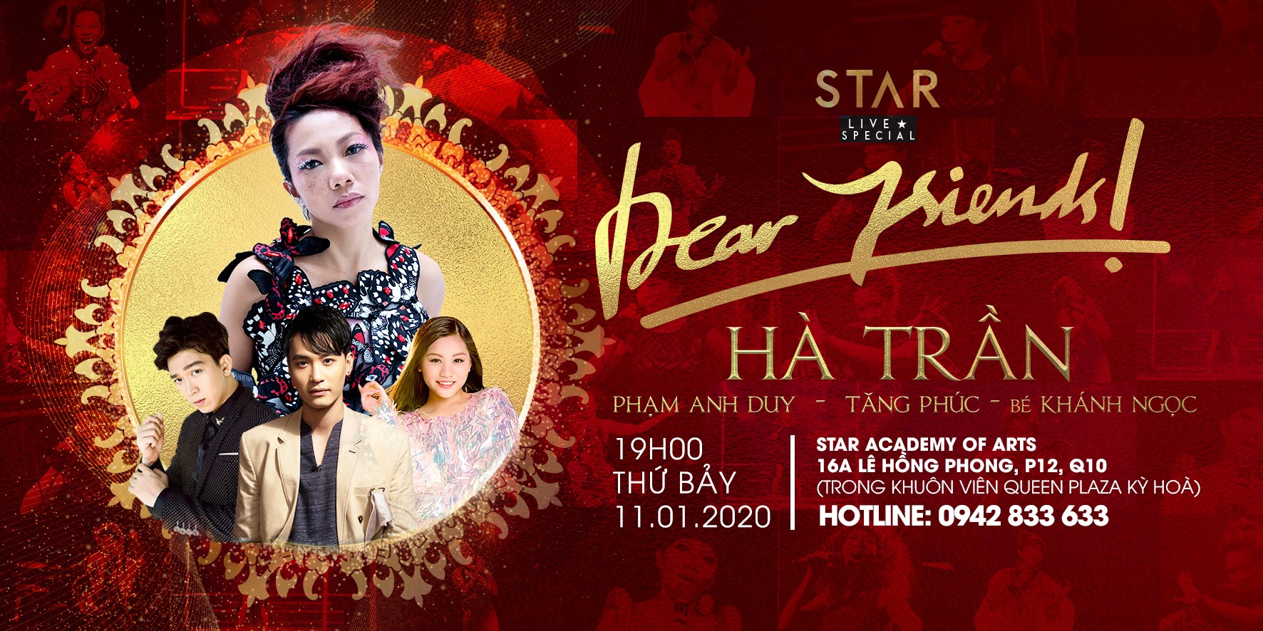 Được biết, đêm nhạc STAR Live Special “Dear friends!” chỉ diễn ra có duy nhất một đêm 11/1/2020, cùng với sự góp mặt của ca sĩ Phạm Anh Duy, Tăng Phúc và bé Khánh Ngọc. Hơn 20 bài hát sẽ được Diva Hà Trần và ca sĩ biểu diễn trong đêm nhạc.