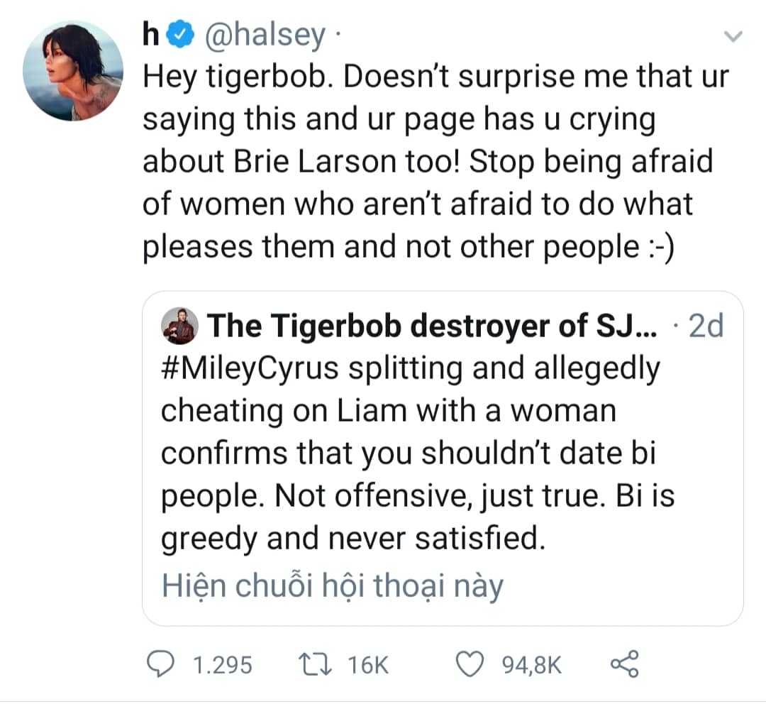 Cụ thể, tài khoản đó đã có một bài tweet nhắm thẳng vào Miley Cyrus với nội dung: “Miley Cyrus chia tay với Liam vì dường như cô ta đã ngoại tình với một người phụ nữ, các bạn thấy rồi đó chúng ta đừng nghĩ tới việc hẹn hò với một người song tính. Tôi không có ý nói xấu cô ấy đâu, nhưng sự thật thì là vậy đó. Người song tính lúc nào cũng tham lam và không biết điểm dừng”. Bài đăng với lời lẽ cay nghiệt này sau đó đã lọt vào tầm ngắm của Halsey, nữ ca sĩ nổi tiếng là người hết mình ủng hộ cộng đồng LGBT. Không thể đứng yên nhìn đồng nghiệp bị mỉa mai cũng như những lời lẽ không hay về LGBT của anti-fan này, Halsey đã thẳng thừng đáp trả: “Chị cảm thấy chả có cái quái gì để ngạc nhiên khi cưng lại nhổ ra những lời như thế , nhất là khi cưng còn khóc mướn cho Brie Larson. Cưng cũng nên bớt cái thói run sợ của mình lại khi chứng kiến phụ nữ bọn chị làm những điều mình thích đi. Bọn chị không sống để làm vừa lòng tất cả mọi người đâu nhé!”.