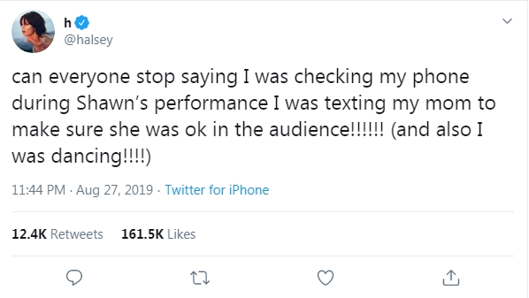 Ngay khi đoạn clip Halsey chăm chú sử dụng điện thoại và “lơ đẹp” màn trình diễn của Shawn Mendes được đăng tải, khán giả đã tỏ ra bất bình và chỉ trích thái độ của cô nàng. Mới đây, Halsey đã đăng dòng tweet để giải thích lí do cho hành động hờ hững của mình: “Mọi người có thể dừng nói rằng tôi chỉ mải mê lướt điện thoại trong khi Shawn biểu diễn được không. Lúc đó tôi đã nhắn tin cho mẹ mình để chắc rằng bà ấy vẫn ổn ở hàng ghế khán giả!!! (Và tôi cũng có nhảy nữa mà!!!)”