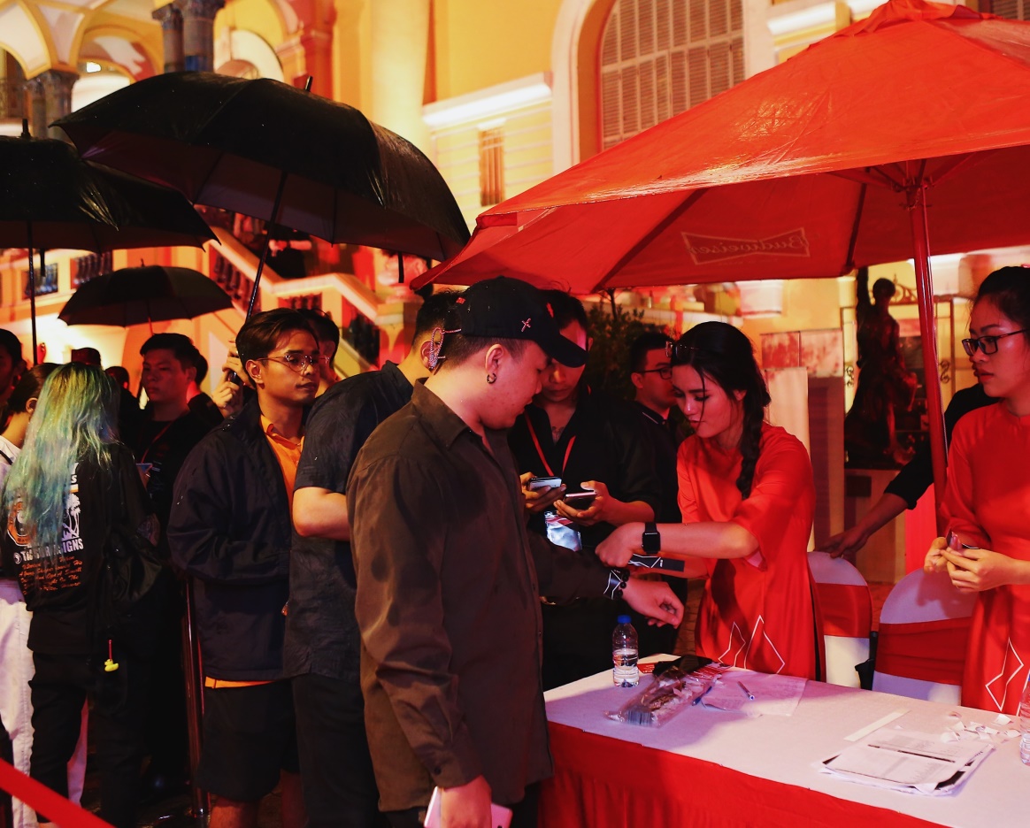 Đúng là dân chơi không sợ mưa rơi. Hàng trăm khách mời vẫn trật tự và kiên nhẫn xếp hàng tham gia sự kiện trong đêm mưa 29/05.