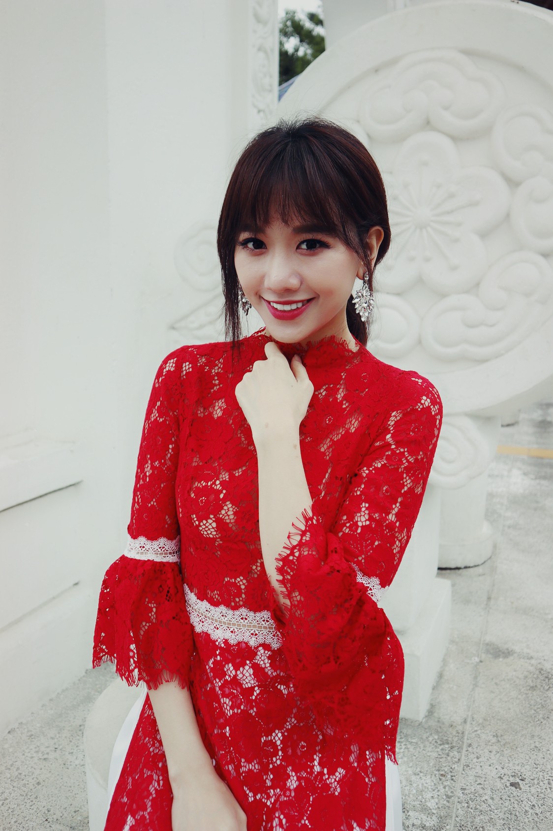 Hari Won diện trang phục áo dài chất liệu xuyên thấu, khi là ren, lúc là voan với 2 tông màu chủ đạo trắng - đỏ.