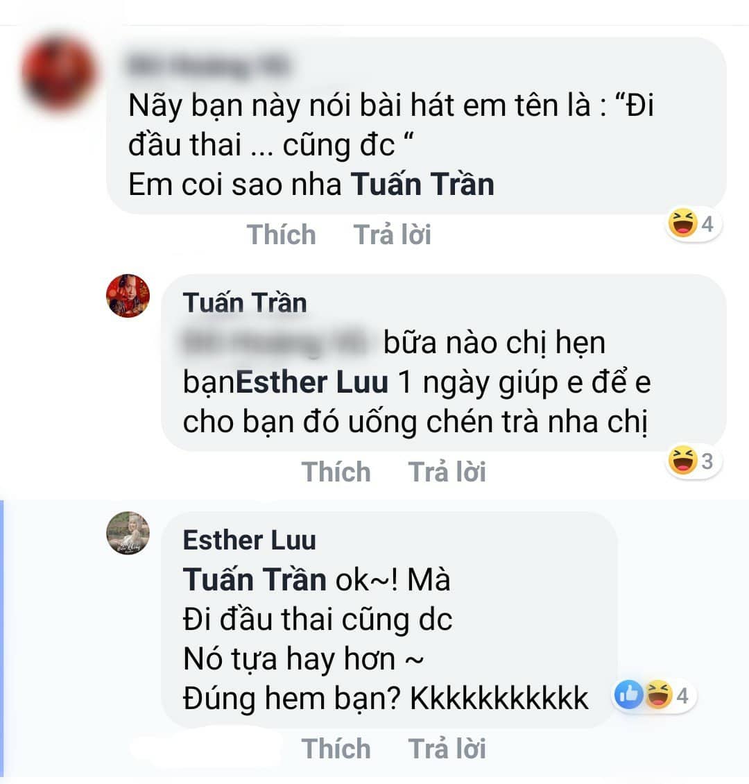 Sau khi biết được “hung tin” từ người bạn thân của mình, Tuấn Trần đã thẳng thắn bày tỏ mong muốn được gặp Hari Won để “uống trà đàm đạo” cũng như ba mặt một lời. Mặc dù không khó để nhận ra sự “cạnh khóe” trong comment của Tuấn Trần, nhưng Hari Won vẫn một mực khẳng định rằng cái tên “Đi đầu thai cũng được” hay hơn rất nhiều so với cái tên gốc của bài hát. Đến đây thì Tuấn Trần dường như đã… cạn lời trước sự hồn nhiên và tỉnh bơ của người bạn thân, nên anh chàng đã quyết định chấm hết cho câu chuyện.