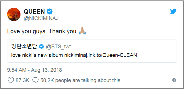 Được biết, lý do thực sự là vào ngày 16/8 vừa qua, BTS đã tweet bài viết thể hiện sự yêu thích của nhóm về album phòng thu mới nhất của Nicki Mina với tên gọi là Queen. Ngay sau đó, cộng đồng ARMY đã cùng nhau tổ chức một buổi party stream nhạc cho Nicki Mina và phổ biến nó bằng dòng hagtag #BTSQueenStreamingParty. Đáp lại sự nhiệt tình của người hâm mộ BTS, các Harujuku Barbies (fan Nicki Mina) cũng đã kêu gọi cùng nhau hagtag và stream ca khúc Fake Love cũng như ủng hộ sản phẩm comeback của nhóm nhạc Kpop này trong thời gian tới.