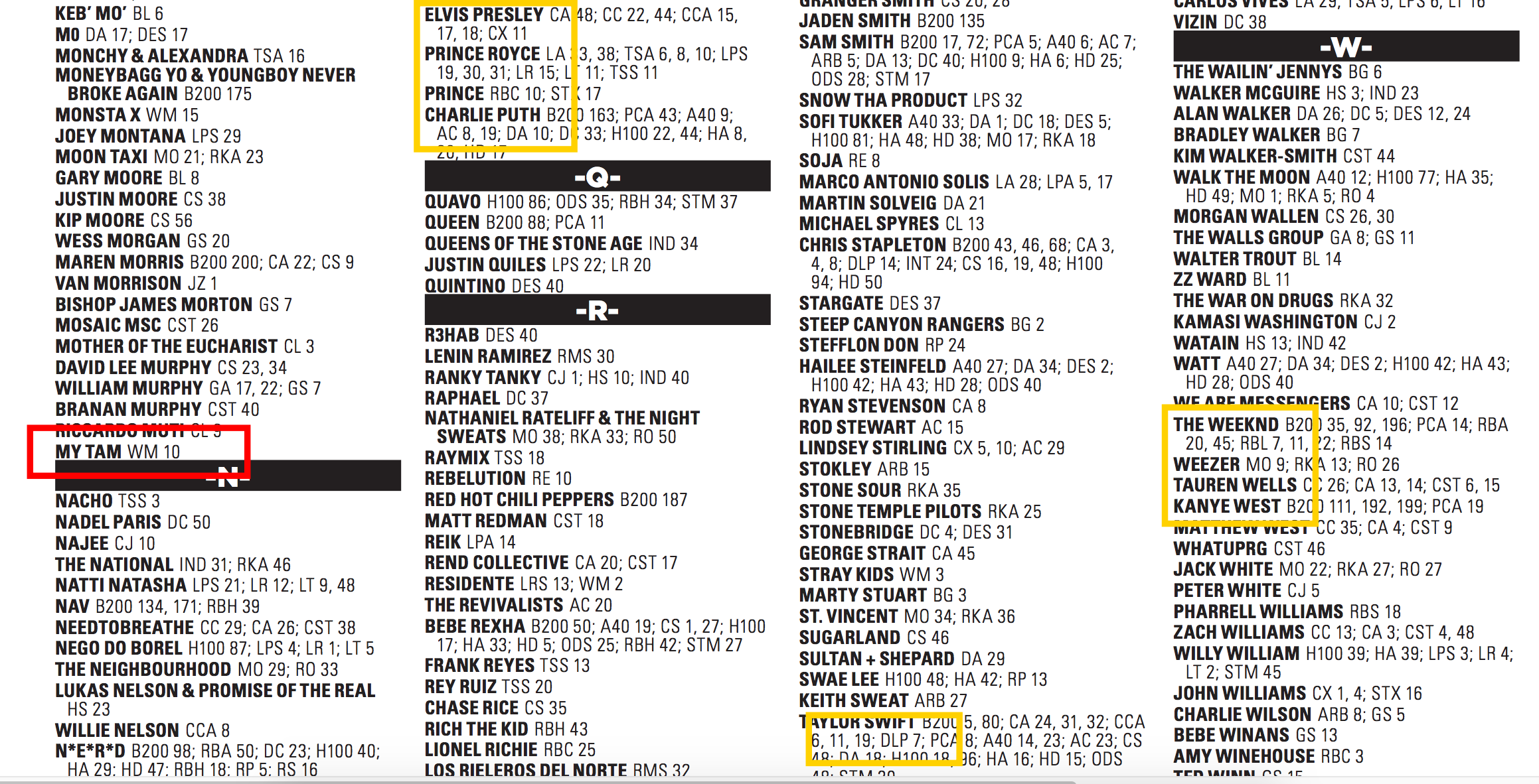 Mỹ Tâm xuất hiện trong danh sách này. Bên cạnh đó còn có nhiều ngôi sao nổi tiếng và quen thuộc với fan Việt như Taylor Swift, The Weekend, Charlie Puth, Elvis Presley,…