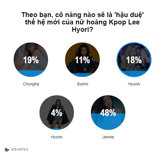 Trong khi Hyorin xếp thứ 5 với 4% bình chọn.